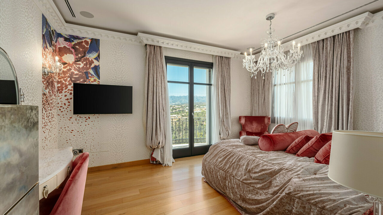 A symbol of opulence and nobility, the breathtaking 3-level residence includes on the ground floor: a large elegant living roomwith a fireplace, a stunning dining room, a fully equipped modern kitchen, an office and a guest toilet. The living areas have access tothe perfectly groomed park-style gardens with a heated pool encouraging the glorious Mediterranean lifestyle. Upstairs, there are 5remarkable en-suite bedrooms with direct access to large terraces enjoying fantastic sea and mountains views. The lower level hostsentertainment and health areas (SPA, Turkish bath, sauna, gym, relaxation room, glassed bodega, etc.), as well as 2 separate guest orstaff apartments, a laundry room, etc. A private garage has space for 3 cars of your collection. Open and closed terraces invite to enjoy all-year-round pleasant weather. A belvedere takes advantage of a scenic view.