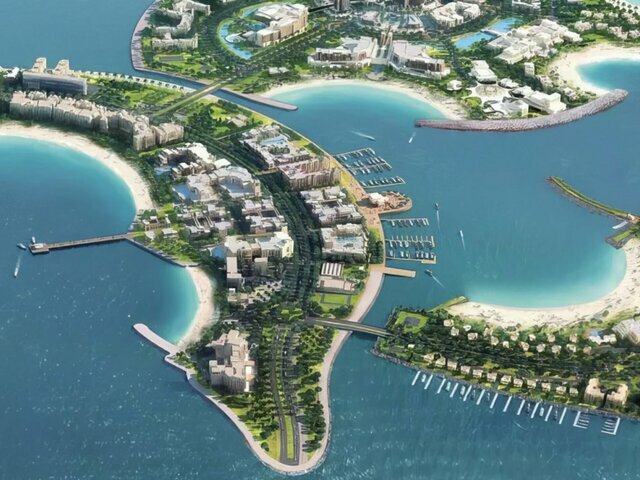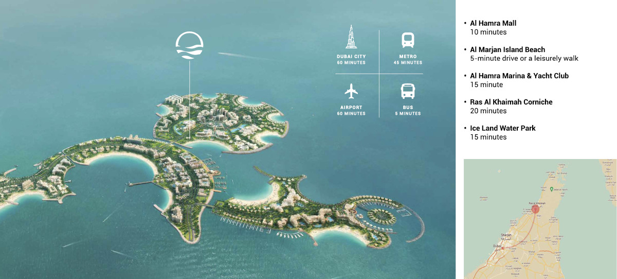 The island of Al Marjan is a group of 4 coral-shaped islands in a man-made archipelago in the Al Jazirah Al Hamra district of Ras Al Khaimah which extends 4.5 kms into the sea and covers an area of 2.7 million sqm.